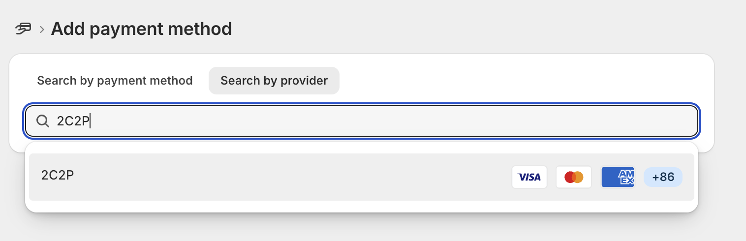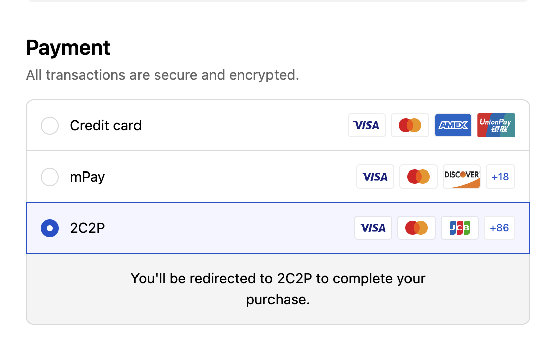 Effortless payment integrationMerchants do not need to worry about API integration as it is all managed by Shopify and 2C2P. Merchants are only required to set up payment on the Shopify admin portal.
