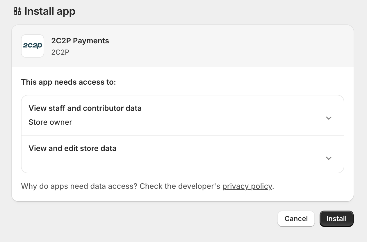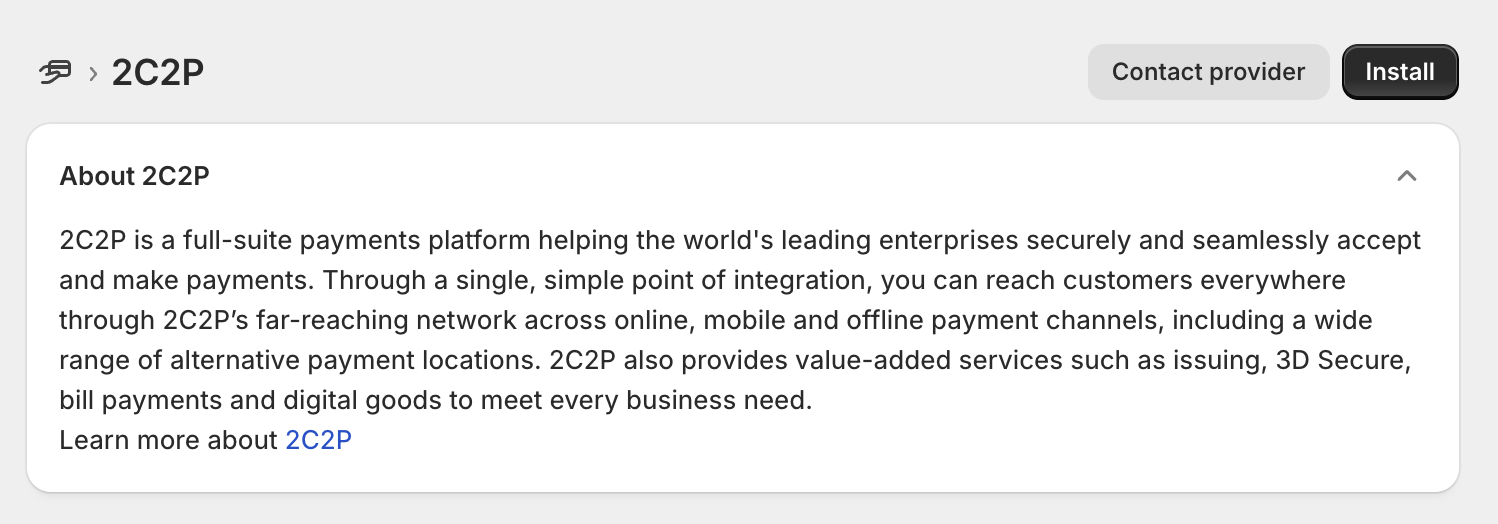 During merchant onboarding with 2C2P, merchants are required to provide their Shopify Shop ID. The 2C2P team will then configure the integration on the backend.