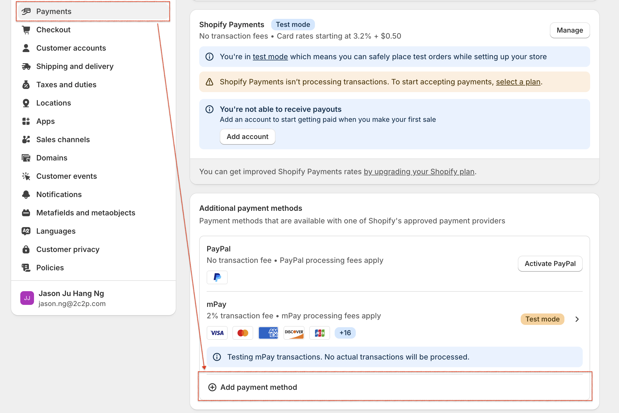 - Go to Settings > Payments > Additional Payment Methods > Add payment method.
